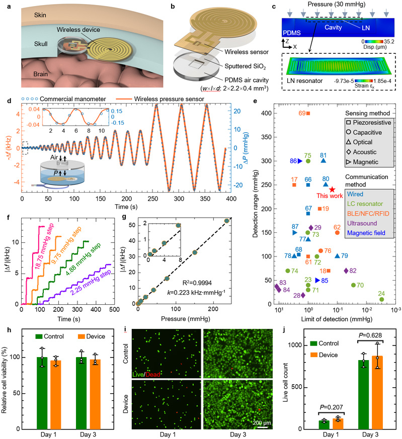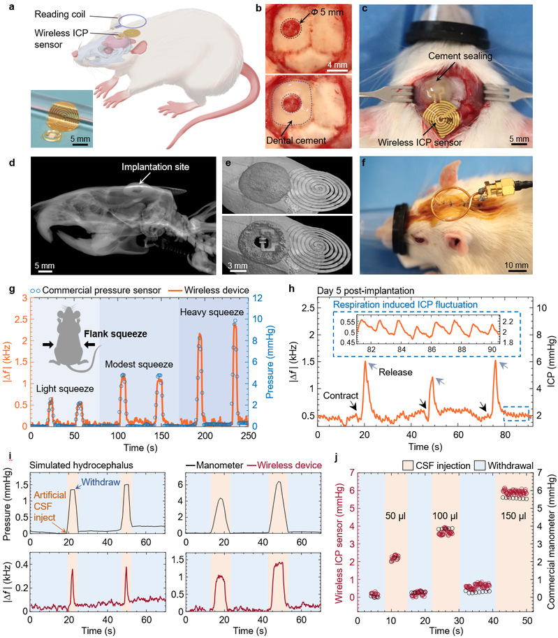 在大鼠模型中的植入实验成功验证了器件在真实生理环境下的功能。器件能够准确响应由腹部压迫引起的急性颅内压变化,并与商用压力计结果高度吻合。在模拟脑积水的病理模型中,器件能精准追踪脑脊液容量变化引发的颅内压波动,证明了其捕捉临床相关病理生理信号的能力。此外,体外与在体实验验证了器件在长期植入环境下的功能稳定性以及生物安全性。