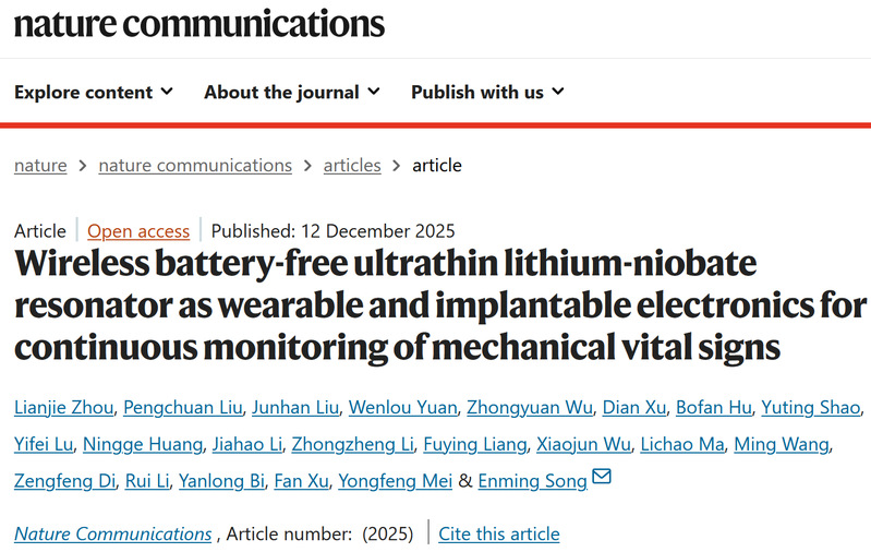 针对上述挑战,宋恩名课题组创新性地将压电薄膜谐振器与无线电感耦合原理相结合,提出了一种能够与人体软组织无缝集成、无需电池、无线的超薄柔性颅内压(ICP)传感系统。利用超薄铌酸锂单晶压电薄膜(LNTF,厚度仅3微米)构建了无线的谐振式传感器,传感器的超薄结构与无芯片设计使其可以贴附于不同生物组织形成共形接触,通过谐振频率的变化来检测微小的机械形变,实现对人体多种生理信号的高灵敏度、实时监测。相关研究成果以“Wireless battery-free ultrathin-lithium-niobate resonator as wearable and implantable electronics for continuous monitoring of mechanical vital signs”为题发表于Nature Communications。复旦大学光电研究院博士后周连杰、博士生刘鹏川为论文第一作者,宋恩名为论文通讯作者。