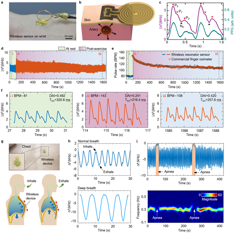 在将无线器件应用于脉搏波监测中,其基于直接机械耦合的传感机制,克服了传统光电容积描记技术易受环境光干扰、检测位置位于毛细血管导致的波形细节模糊等缺点。实验结果显示,该器件能捕获更清晰的脉搏波形特征,并能追踪不同运动状态下脉率与波形形态的连续变化,证明了其在心血管功能评估方面的应用潜力。此外,通过将器件贴附于胸腔皮肤,利用呼吸过程中胸腔容积变化引起的皮肤应变导致的谐振频率偏移,可以实现对不同呼吸模式和呼吸暂停的监测。