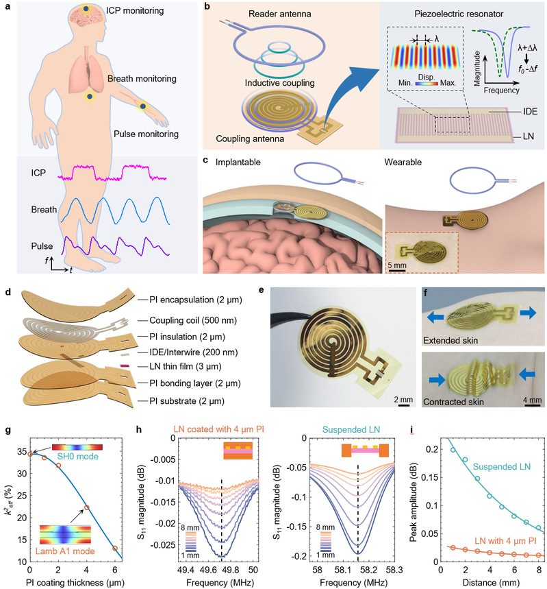 研究团队以超薄单晶铌酸锂薄膜为功能材料、聚酰亚胺(PI)为柔性基底,通过柔性转印与微纳加工工艺构建了厚度仅约10 μm的超薄、柔性无线谐振器件。其中,压电谐振器叉指电极的周期长度λ决定其共振频率f₀,而生物组织界面的机械应变会引起周期长度变化,从而导致共振频率偏移。这种工作原理使得外部读取天线能够以无线、高灵敏的方式捕捉谐振器共振频率的连续变化。通过有限元仿真与实验验证发现悬空结构能使压电薄膜谐振器的振动能量局域于LNTF内,并维持在水平剪切(SH0)共振模式,从而将谐振器机电耦合效率提升至最高35%,进而有效提高无线传感的距离和信号强度。